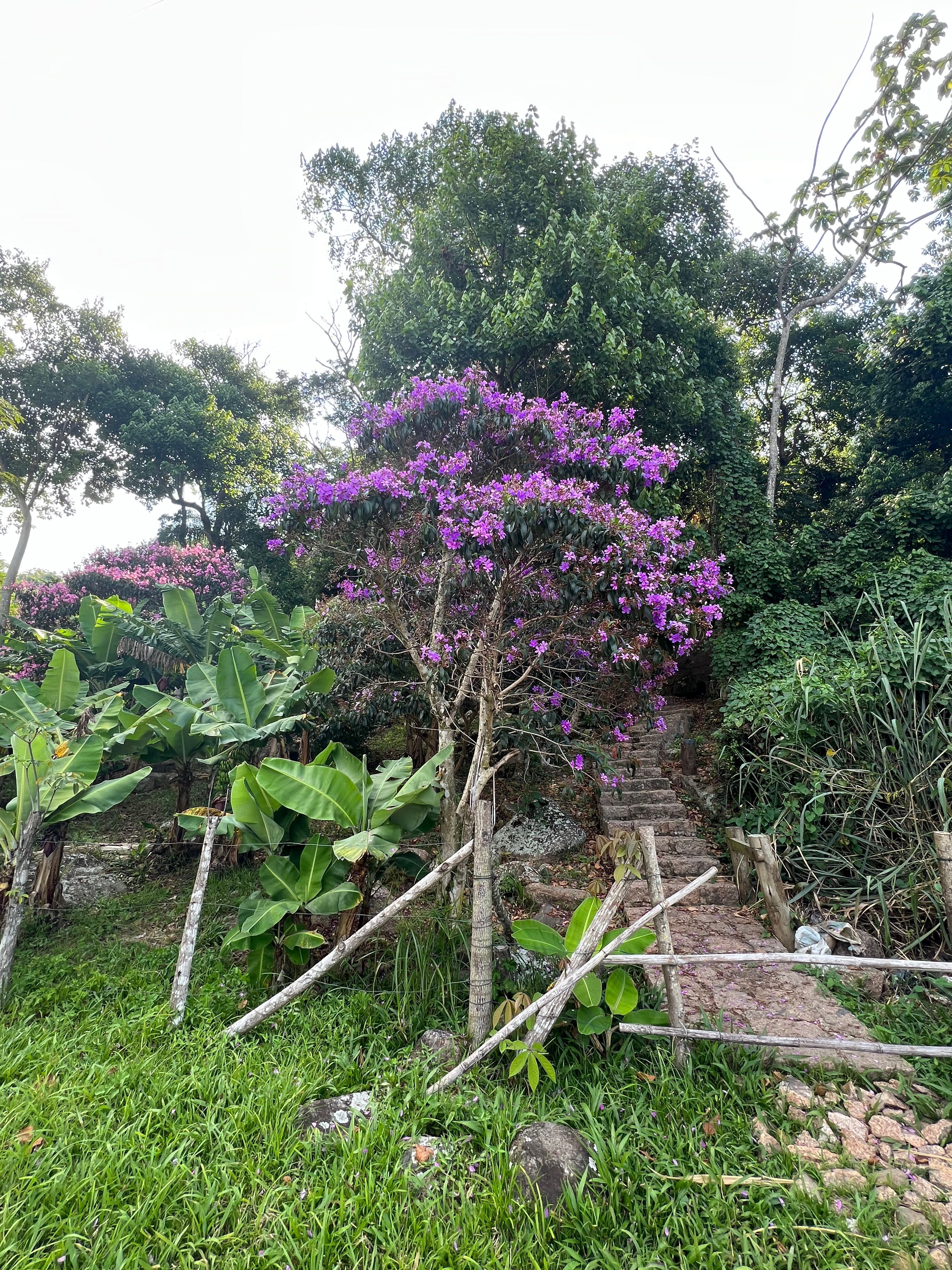 We went to the courtyard in the house and both put our hands on the thick, short blades of uncut grass. I wiggled my pinky finger over to be in contact with hers while we connected with earth. I soaked in the beauty of the fuchsia flowers that had fallen on the ground, the periwinkle of Anna’s dress and the band on her wrist, and the deep purple yoga mats hang drying from the morning workout in the background, all the colors dancing together.
