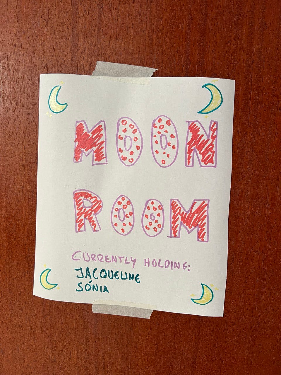 I stayed in bed for most of the day. Sónia joined me on couple of additional low beds functioning as futons, next to the airy window and vibrant green plants in my room. We each went slow, rested, and worked on what we wanted to work on. We played some of our favorite Moon songs. We ate the food, took the calls, shared feelings that came up when and was we wanted. Sónia even made a Moon Room sign for us that she put up on the door and is still proudly hanging there because I love it!